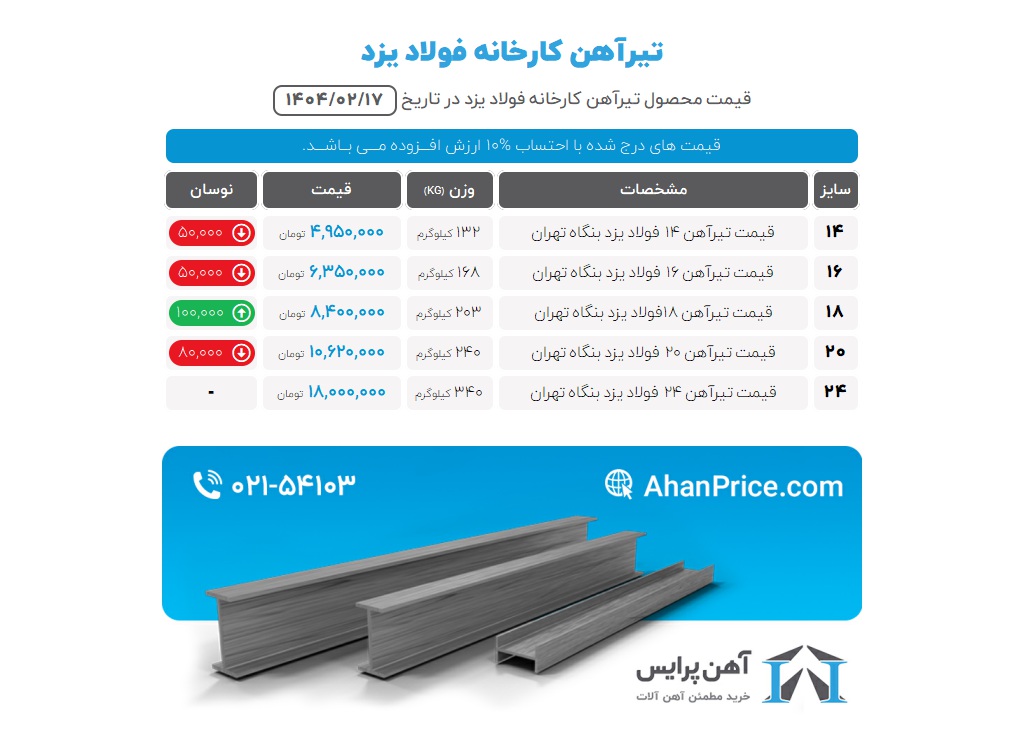 در همین راستا برای خرید مطمئن و راحت تیرآهن 24 میتوانید از طریق شماره 02154103 با کارشناسان آهن پرایس تماس بگیرید و علاوهبر دریافت مشاوره رایگان، آخرین قیمت تیرآهن 24 را نیز استعلام بگیرید و خرید بهصرفهای تجربه کنید.