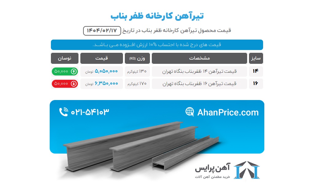 شما می توانید قیمت روزانه محصولات این کارخانه از جمله قیمت تیرآهن ظفربناب را در سایت و کانال آهن پرایس مشاهده کرده و به منظور خرید تیرآهن ظفر بناب و اطلاع از قیمت تیرآهن روز و قیمت روز آهن آلات دیگر با کارشناسان مجموعه آهن پرایس در ارتباط باشید.