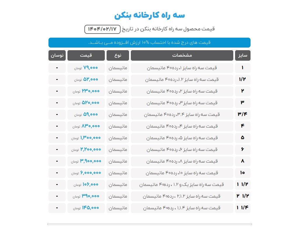 حالا که درباره قیمت سه راه بنکن صحبت کردیم، بد نیست اشاره‌ای هم به این بکنیم که در بازار ایران این سه راه مانیسمان در چه انواع و ابعادی وارد شده و به فروش می‌رسد.