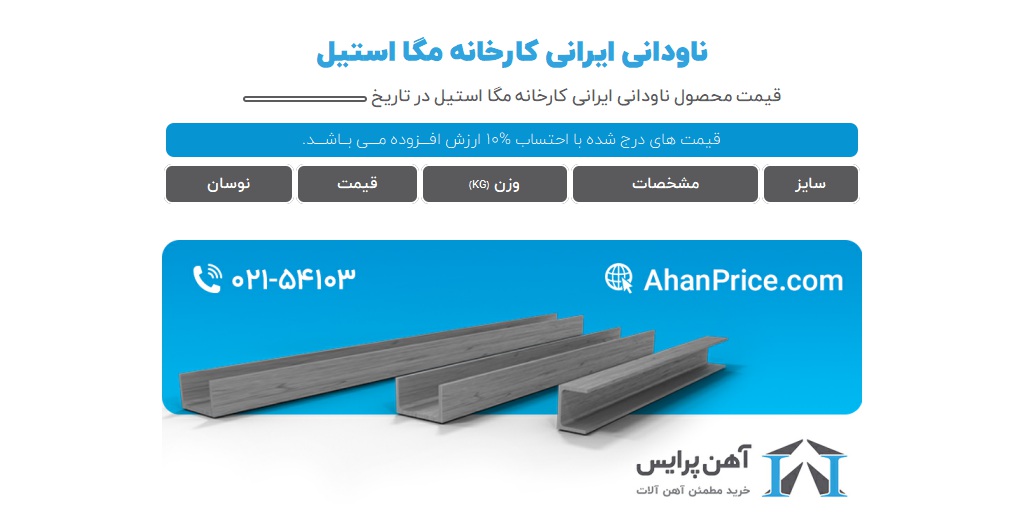 قیمت روز کلیه آهن آلات از جمله قیمت ناودانی، به طور لحظهای بر روی وبسایت آهن پرایس قرار میگیرد که تا پایان همان روز اعتبار دارد، همچنین قیمت کلیه محصولات در همان روز در کانالهای تلگرامی آهن پرایس نیز درج میشود که به راحتی در اختیار مشتریان قرار میگیرد، علاوهبراین برای کسب اطلاعت بیشتر و دریافت مشاوره، میتوانید از طریق شمارهگیری 02154103 با کارشناسان حرفهای آهن پرایس در تماس باشید تا خریدی راحت و مطمئن را تجربه کنید.