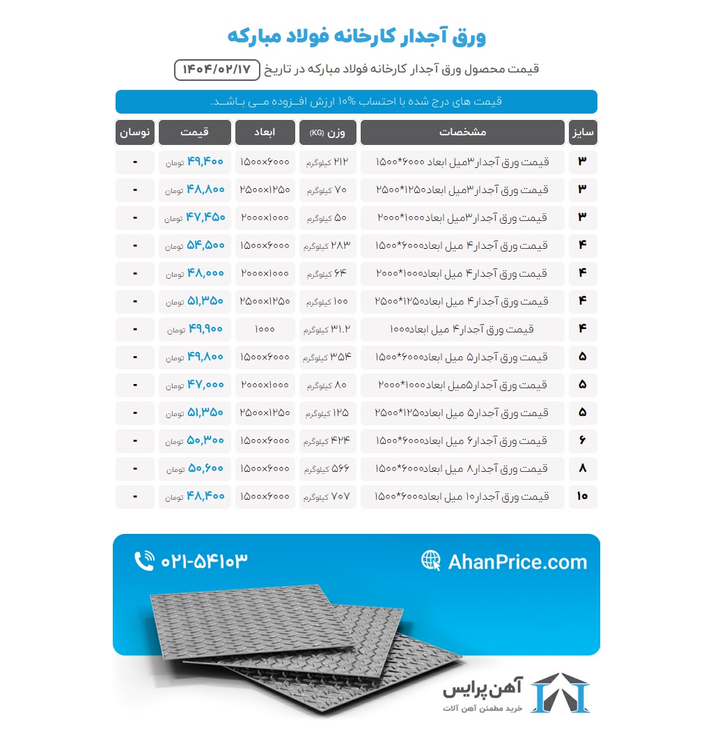 در صورتی که قصد خرید ورق آجدار فولاد مبارکه اصفهان را دارید و میخواهید قیمت روز این محصول را به دست آورید، برای استعلام قیمت هم میتوانید بهطور روزانه به این صفحه مراجعه کنید و هم میتوانید با شماره ۰۲۱۵۴۱۰۳ تماس بگیرید و قیمت روز ورق آجدار فولاد مبارکه از کارشناسان فروش آهن پرایس سوال کنید و از همانجا هم سفارش خود را ثبت کنید.