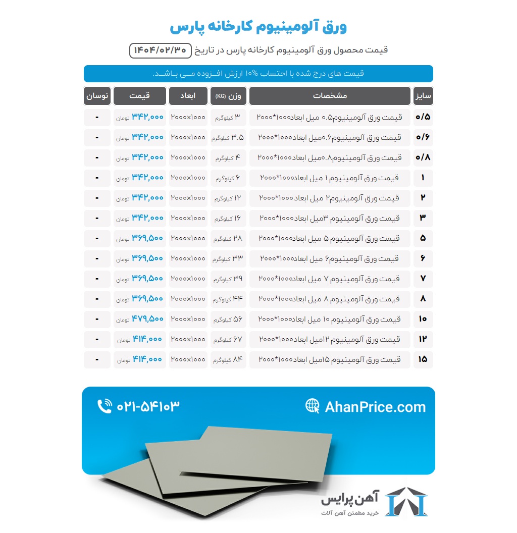 قیمت ورق آلومینیوم 12میل ابعاد1000*2000 کارخانه پارس -