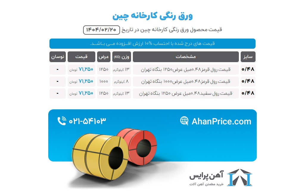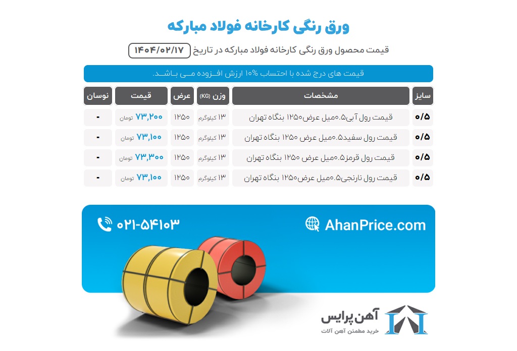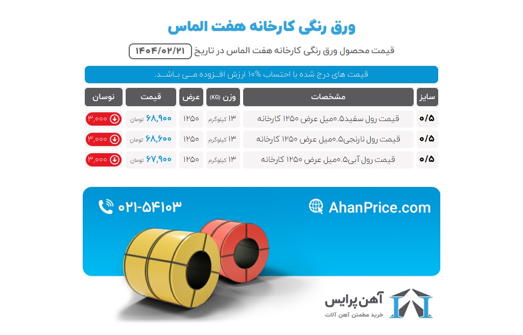 قیمت های ورق رنگی روزانه در سایت آهن پرایس درج می گردد، شما برای مشاهده قیمت به روز محصولات کافی است، هرروز سایت مجموعه و کانال تلگرامی را چک بفرمایید و یا با شماره 02154103 از مشاوره حرفه ای کارشناسان ما بهرهمند شوید.