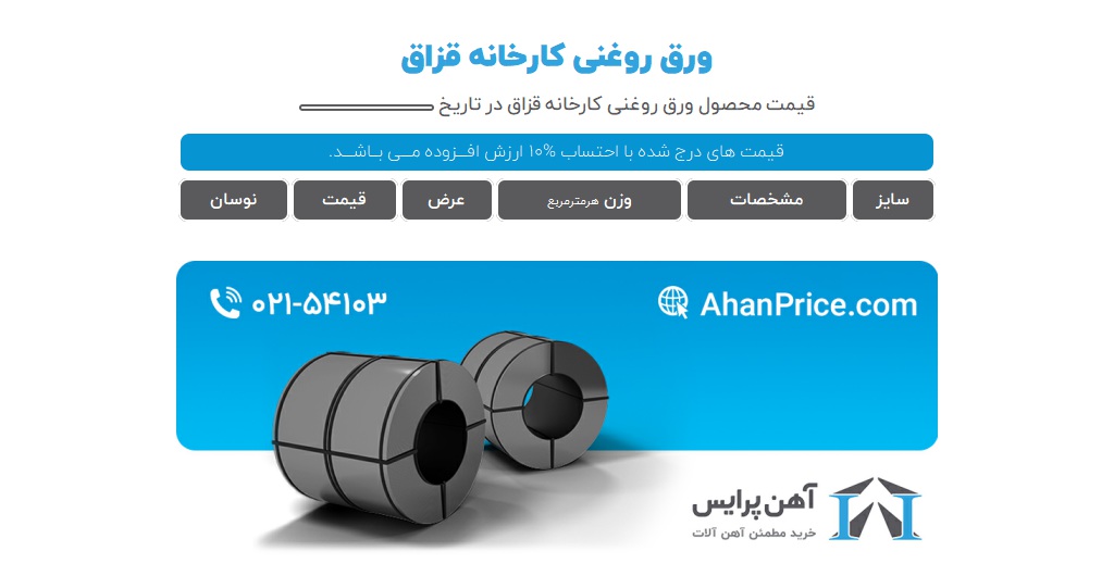 قیمت رول ورق روغنی و شیت به صورت روزانه در وب سایت آهن پرایس به روزرسانی میشود. همچنین نمودار قیمت ورق روغنی کارخانههای معتبر کشور در بازههای زمانی هفتگی، ماهانه، سه ماهه، شش ماهه و سالانه در دسترس شما قرار دارد. علاوه بر این، برای دریافت مشاوره و اطلاع از بهترین زمان خرید میتوانید با شماره 02154103 تماس بگیرید تا کارشناسان ما شما را راهنمایی کنند.