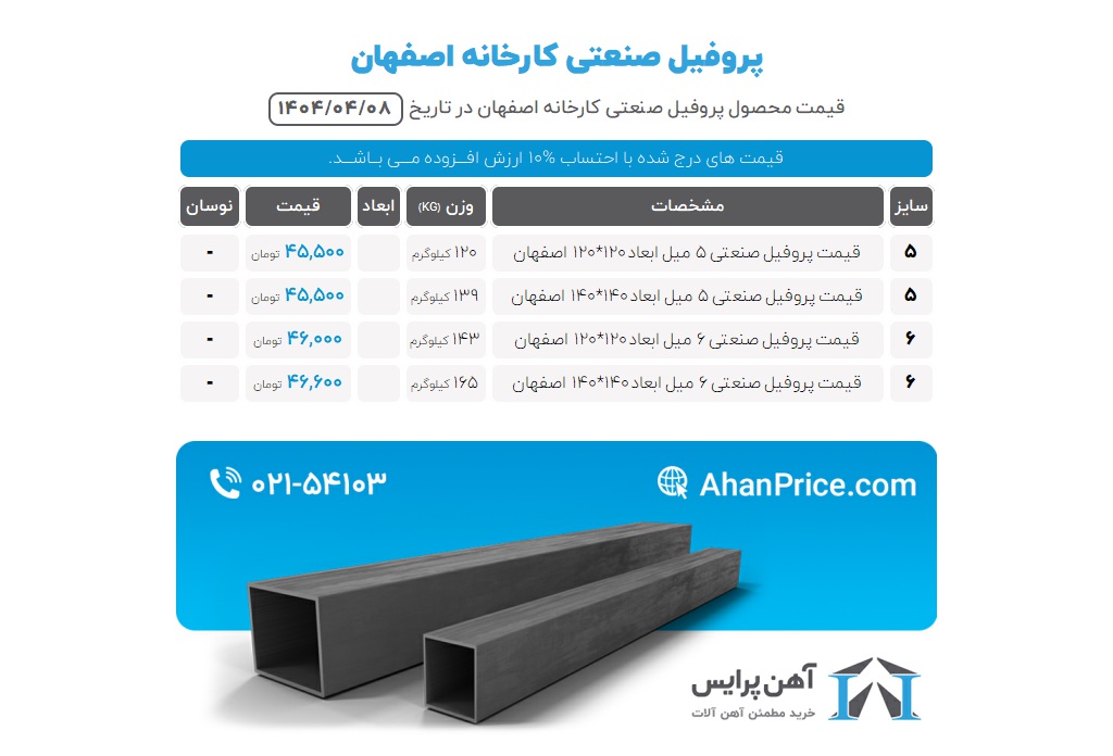 قیمت پروفیل صنعتی کارخانههای مختلف به طور روزانه در سایت آهن پرایس درج میشود و ما میتوانید پیش از خرید آخرین قیمت پروفیل صنعتی را در همان روز مشاهده کنید. در واقع تا زمانی که کارخانه تولیدکننده قیمت جدید ندهد قیمت پروفیل صنعتی درج شده در سایت دارای اعتبار است.