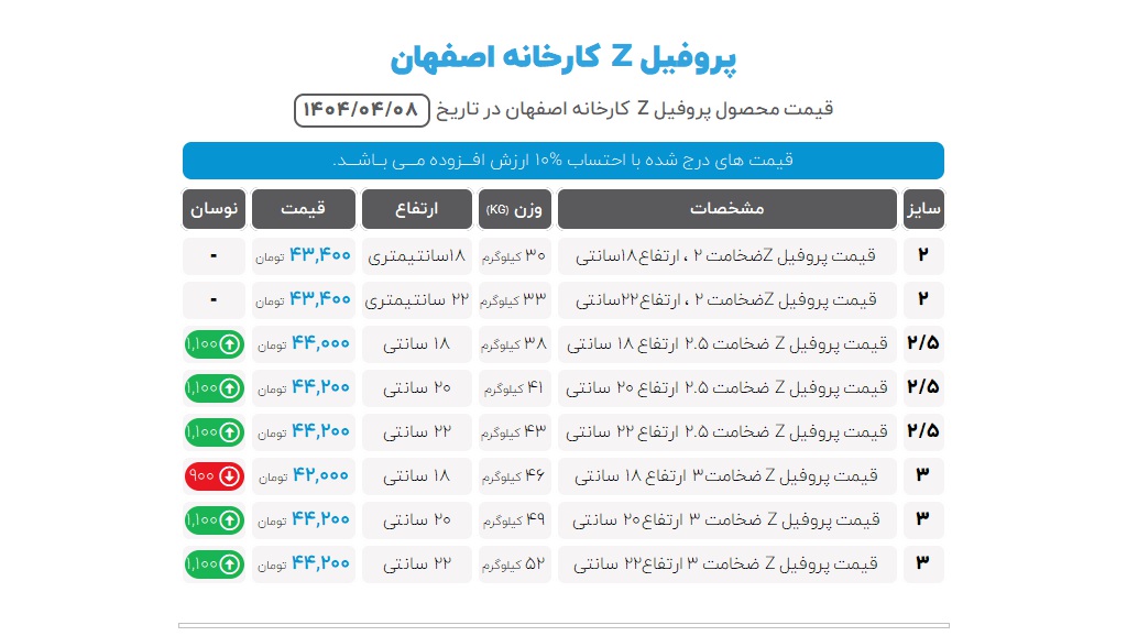 علاوهبراین ضروری است چند نکته مهم را پیش از خرید پروفیل زد در نظر داشته باشید، ضخامت، وزن و سایز از جمله مواردی است که در تعیین قیمت محصول نقش مهمی دارد، به عبارتی هر چقدر وزن و ضخامت پروفیل زد بیشتر باشد قیمت آن نیز افزایش مییابد. از آنجایی که پروفیل زد از ورق تولید میشود، هر نوع تغییر قیمت در ورق به تغییر نرخ روز پروفیل زد منجر خواهد شد.