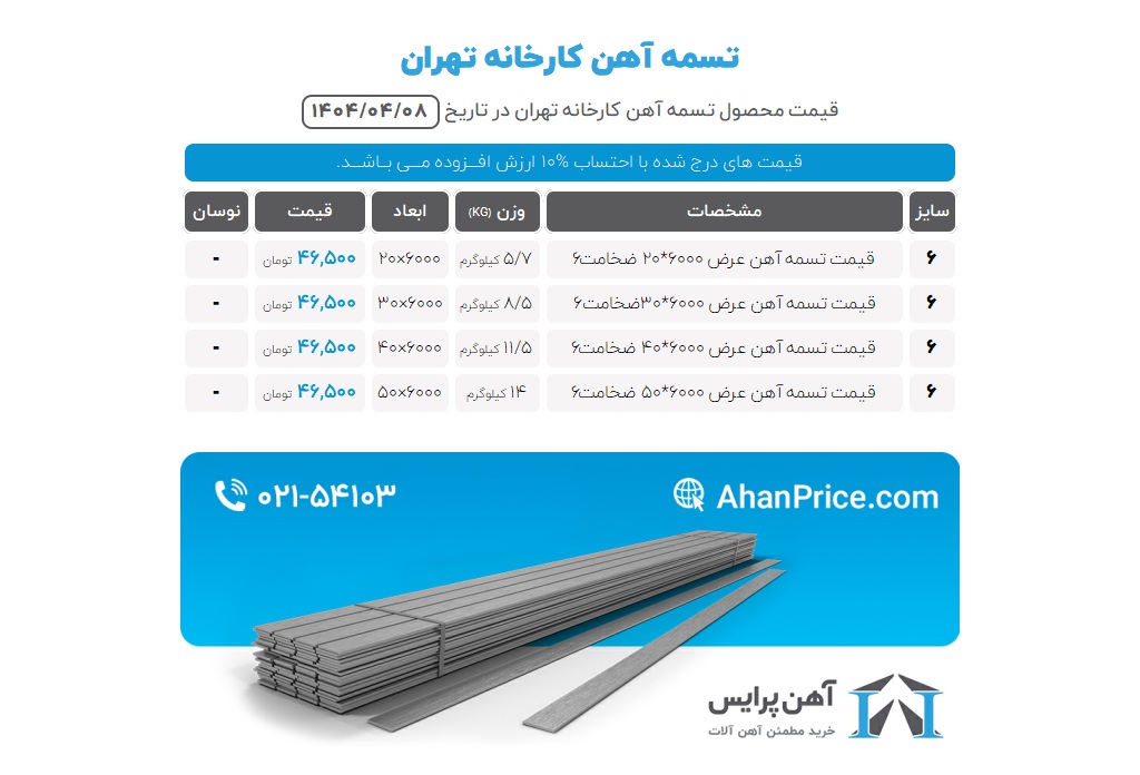 یکی از مزایای برجسته خرید از مجموعه آهن پرایس این است که برای ثبت سفارش هیچ محدودیتی وجود ندارد و خرید تسمه آهن با حجم دلخواه شما امکان پذیر است. همچنین میتوانید قیمت روز تسمه آهنی را در وبسایت و کانال تلگرام آهن پرایس مشاهده کنید. در هنگام ثبت سفارش به روش تولید، نوع تسمه مورد نیاز، ضخامت و ابعاد مد نظر، مشخصات فیزیکی و برند تسمه آهنی توجه کنید. اگر در خصوص این موارد نیاز به مشاوره دارید، همین حالا با شماره 02154103 تماس بگیرید و از خدمات مشاوره و دریافت پیش فاکتور رایگان بهرهمند شوید.
