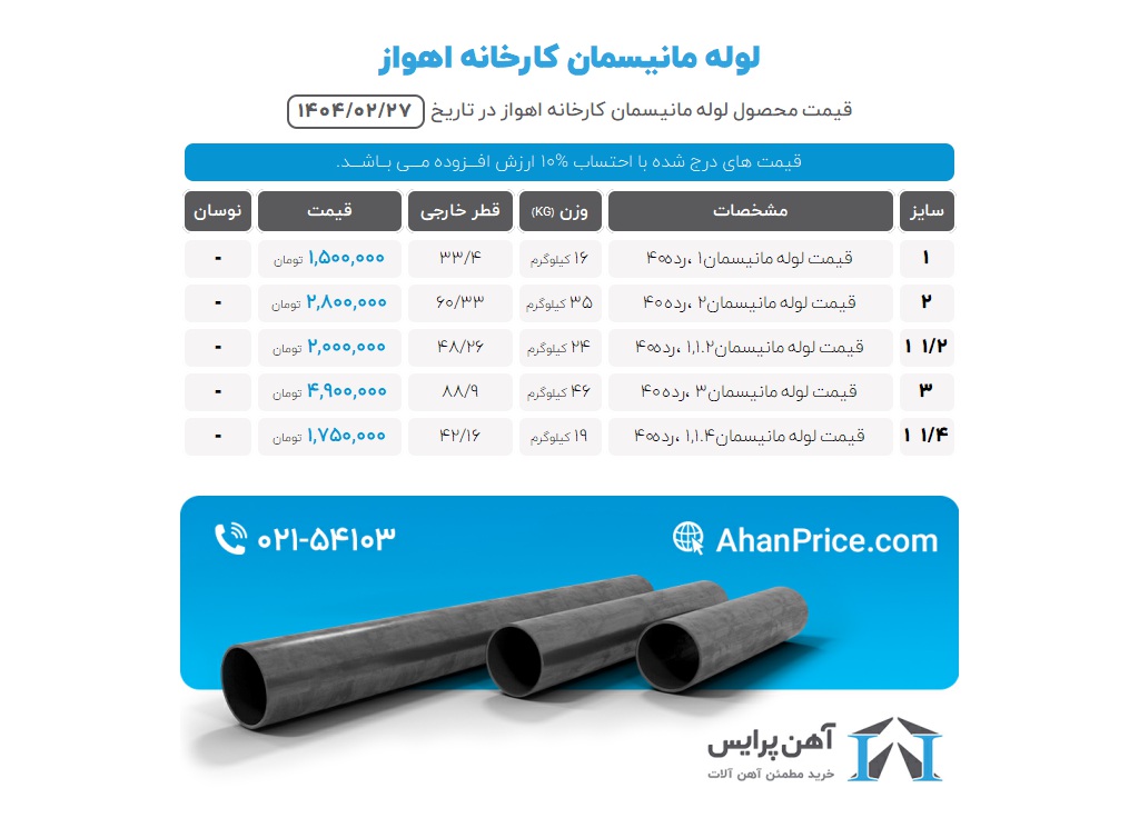 قیمت لوله مانیسمان و کلیه محصولات فولادی به صورت روزانه بر روی وبسایت و کانال‌های شرکت آهن پرایس به‌روزرسانی می‌شود و تا پایان همان روز نیز اعتبار دارد، علاو‌ه‌بر این مشتریان عزیز می‌توانند با شماره‌گیری 02154103، علاوه‎بر دریافت مشاوره رایگان از کارشناسان حرفه‌ای آهن پرایس، از قیمت آهن آلات نیز مطلع شوند.