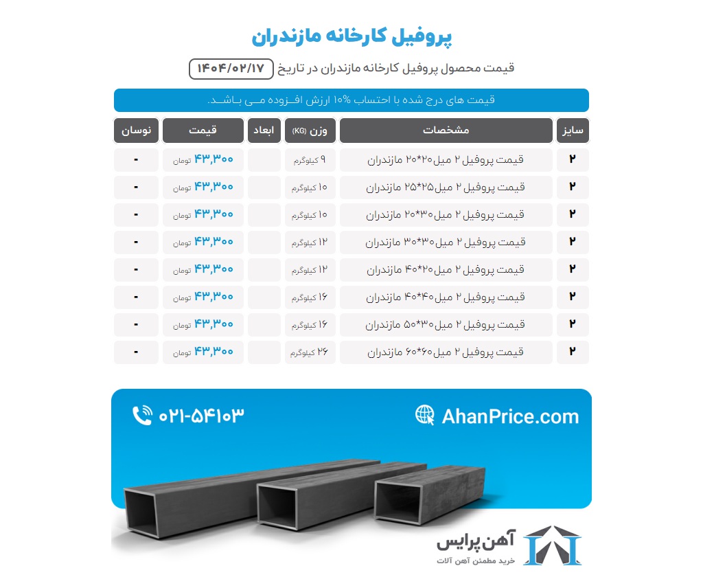 شرکت آهن پرایس قیمت قوطی آهن و سایر محصولات فولادی را به طور روزانه روی وبسایت خود قرار میدهد و شما میتوانید از این طریق آخرین قیمت پروفیل را بررسی کنید و برندهای مختلف از یک محصول را نیز مقایسه کرده و در نهایت خرید مطمئن و به صرفهای انجام دهید.